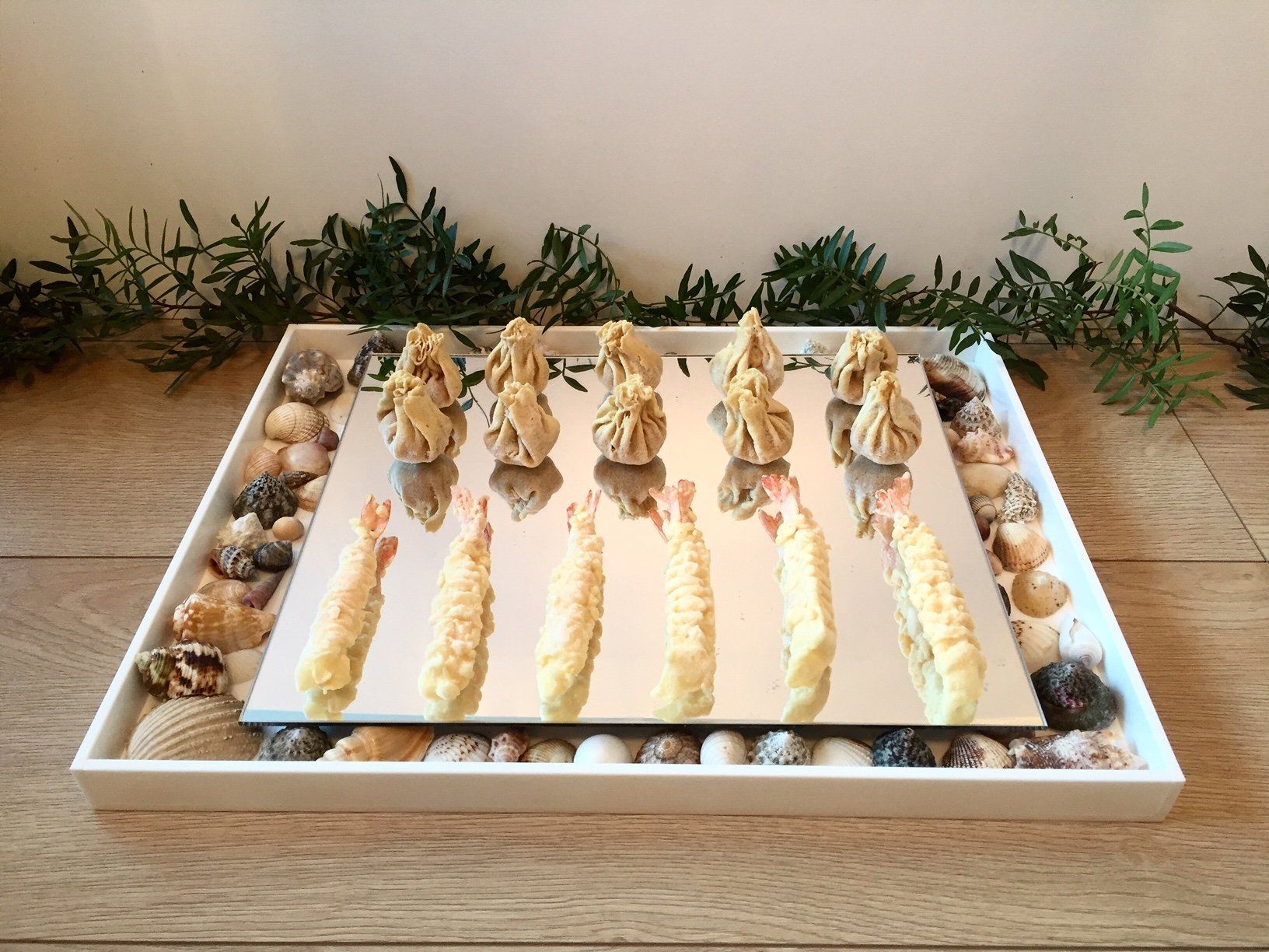 ButtonBlack canape box with mirror inserts - flat or with holes for cones or cups.